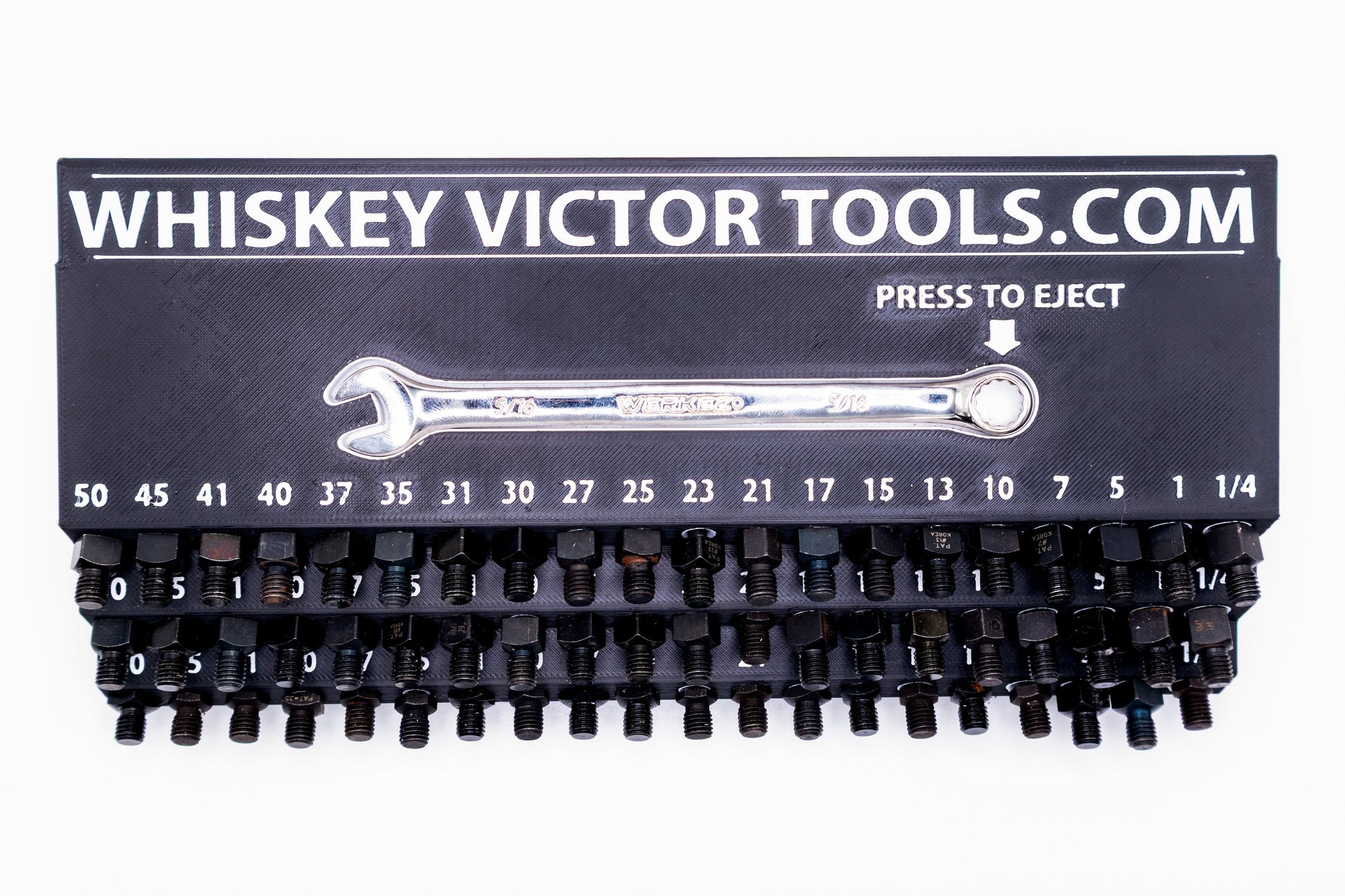 - Labeled for each diameter — a slot for the most common threaded drill bits #50 through 1/4”. Custom arrangements available